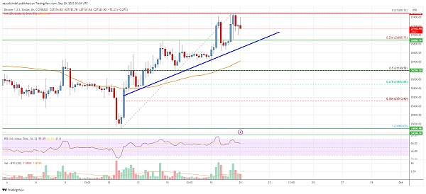 价格交投于 27,250 美元下方,但仍远高于从 24,900 美元波动低点至 27,499 美元高点向上走势的 23.6% Fib 回撤位。目前价格高于 26,850 美元和 55 小时简单移动平均线(4 小时)。