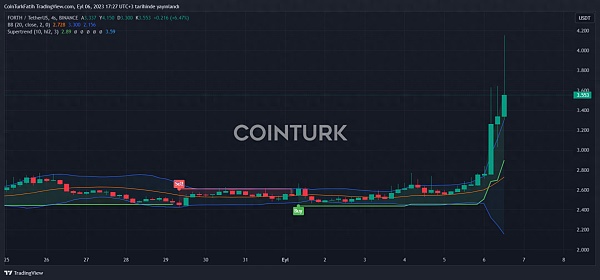 昨天早上开始的上涨引发了从 2.5 美元开始的加速上涨。Forth Coin 的价格似乎已从最后 4 小时蜡烛中 4.15 美元的峰值回落。然而,如果收盘价能够突破 3.6 美元,我们可能会看到价格已经突破了这一阻力位。如果 3.2 美元和 3 美元区域丢失,则可能会回落至 2.74 美元。截至撰写本文时,买家的价格为 3.5 美元。评估今天反弹的投资者已经获利约50%。