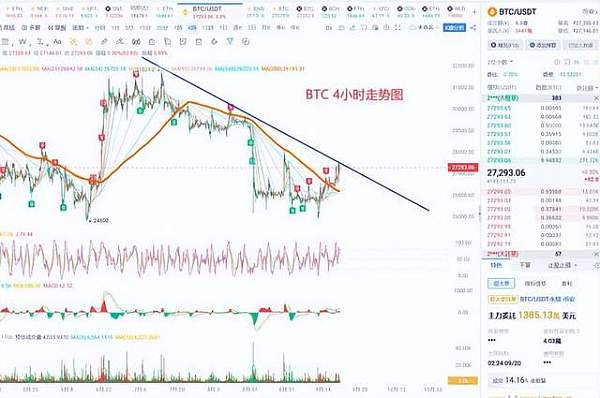 比特币一直在慢慢涨持续破近期本月的新高,但是一直压制在27500没有有效突破,日线上200日均线位置压制位置为27800附近,目前KDJ三线向上散发,macd放量上行,均线上属于26000附近的底部状态,目前的情况技术面一篇欣欣向荣的迹象,等待晚间的数据公布,在拉一波上去即可