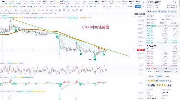 ETH 4小时基本和大哥同步,但是均线没有大哥的走势这么完美是一个多头排列的节奏,但是已经破掉了200日均线的位置并已经站稳,KDJ即将形成金叉状态200日均线位置为1644的点位