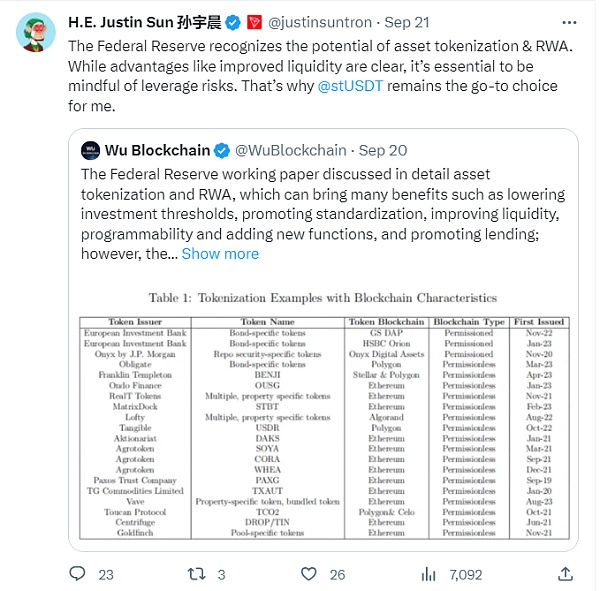 9月21日,波场TRON创始人孙宇晨通过社交媒体表示,美联储已认识到资产代币化和RWA的潜力,其改善流动性等优势显而易见,但也必须谨慎考虑杠杆风险。这就是为什么stUSDT仍是他的首选。