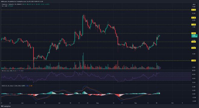 在长达一个月的时间里,LINK 在 6 美元支撑位和 6.4 美元阻力位之间横向交易。从 12 小时时间框架来看,多头在 9 月 18 日占据了上风,涨幅为 11%。这推动 LINK 突破 6.4 美元阻力位。