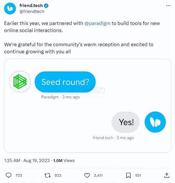 回归加密行业后,Paradigm 立即进军「行业最卷」的 MEV 市场,参与了 Flashbots 在 7 月完成的 6000 万美元 B 轮融资,使其估值增长超 10 亿美元。除 Flashbots 外,Paradigm 在过去几月更令人印象深刻的是其选中并投资的 friend.tech,一手促成了短短两个月市值超 1 亿美元的 Web3 社交新贵。
