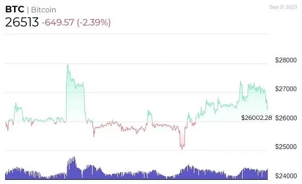 截至撰写本文时,比特币的价格为26,513美元,过去24小时下跌了2.39%,过去7天下跌了0.11%,但在月度图表上仍保持了1.99%的涨幅,根据截至9月21日的最新数据。