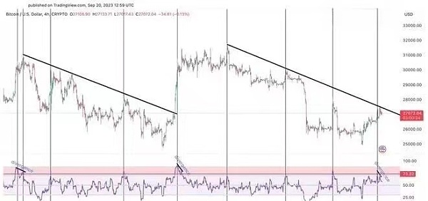 "当比特币(BTC)接近下降阻力趋势线27,440美元时,我们再次看到了这一现象。从这一点开始的修正可能会将比特币的价格下调至25,200美元甚至更低,从而提供了潜在的‘低位买入’机会。”