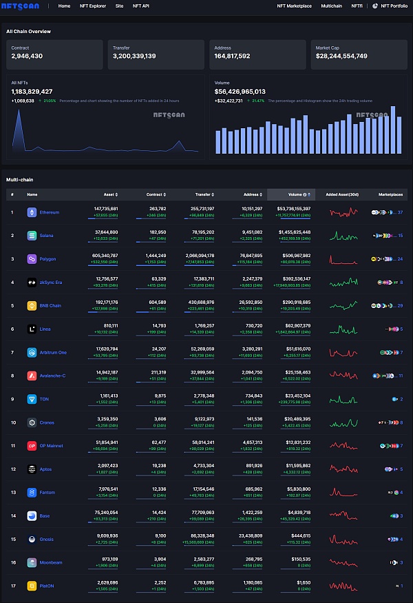 截至 2023 年 9 月 25 日,NFTScan 目前已支持 Bitcoin、Ethereum、BNBChain、Polygon、Solana、Avalanche、Arbitrum、Optimism、zkSync、Aptos、Linea、Base、TON、Fantom、Moonbeam、PlatON、Cronos、Gnosis 18 条主流区块链网络共产生: