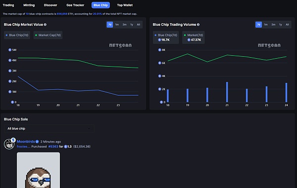 当前 19 只蓝筹合约总市值为 656,058 ETH,占 NFT 总市值的 20.01%。本周:蓝筹 NFT 总交易额为 16.7k ETH 较上周(20.93k)ETH 有近 4.23k ETH 幅度下降,市场总交易额为 47.37k ETH 整体较前一周(58.17k ETH)上升,蓝筹 NFT 的交易额与市场比重走向整体都较为平稳下降趋势,截至 9 月 21 日 00:00 交易额达到最高为 3.08k ETH 左右。