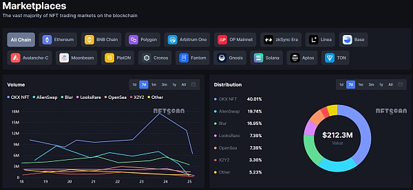 本周:大部分交易市场走势较为起伏,整体交易额在 9 月 23 日达到最高,7d 总交易额 $212.3m 较上一周($168.2m)有近 $44m 的上升。23 日 OKX NFT 市场 1746.7 万美元,本周超 Blur 及 AlienSwap 排名第一,市场交易额分布较稳定,排名前六的交易市场及占比分布:
