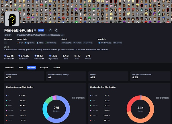 据数据显示,目前以太坊上 MineablePunk 的链上总交易额已超 377.8k ETH,过去 7 天交易分布主要为 LooksRare:5.5k ETH(99.99%)、Opensea:0.3735 ETH(0.01%)过去 7 天交易额 5.5k ETH,交易笔数 38。从持有分布来看 98% 以上的持有者持有期超过 3m-1y 及 1y 以上,社区黏性较强。