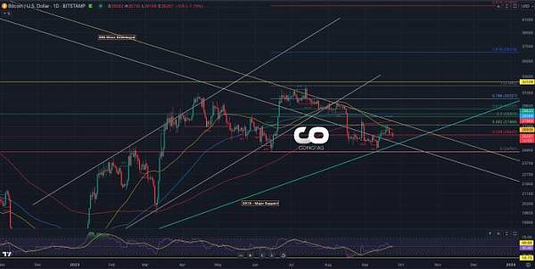 2023 年 9 月 24 日星期日,比特币价格大幅下跌,从 26,500 美元跌至 26,148 美元的低点。目前交易价格为 26,275 美元,24 小时内跌幅超过 -1.5%。如果显着跌破之前提到的 26,432 美元支撑位,并且日收盘价低于该水平,可能会进一步推低价格。