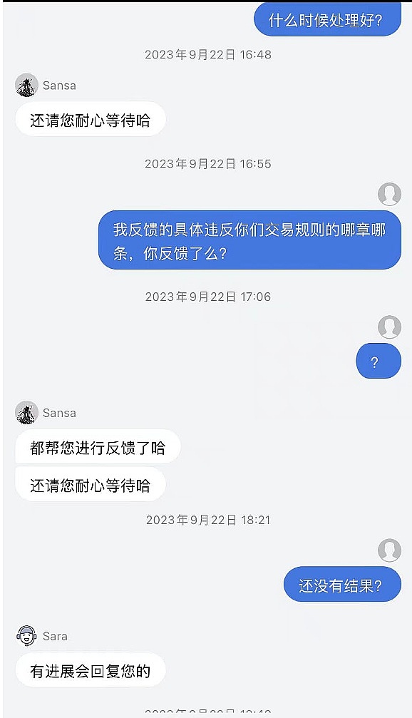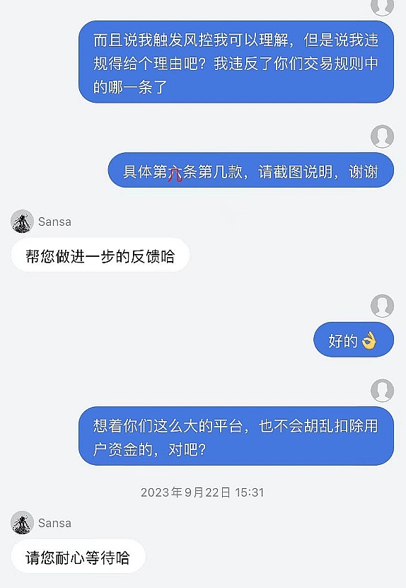 客服一直都是说等待,有进展会回复.但是一直都没有主动回复,问他就还是等,问他违反第几条第几款也说不上来,就说风控。