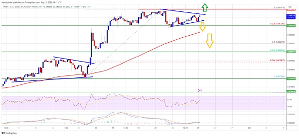 TRX 目前交易价格高于 0.0825 美元和 100 简单移动平均线(4 小时)。