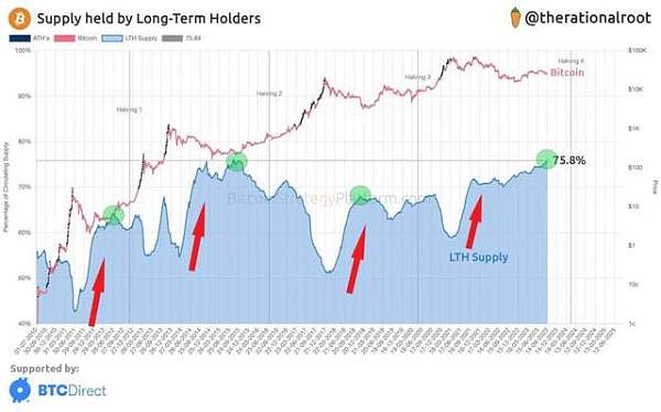 加密货币分析师therationalroot在X上发布了长期持有者手中的比特币供应量图表。他还将比特币每次减半的情况叠加在他的绘图上。在他的图表中,我们首先注意到这样一个事实:目前,LTH 手中的BTC供应比例已接近其历史高点的 76% 附近。这是在 2015 年底设定的,当时BTC价格在第二次减半之前结束了积累阶段。