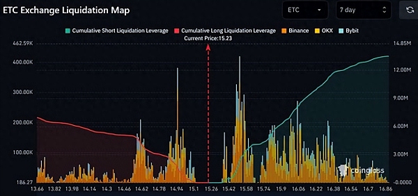 根据Coinglass 的交易所清算图,关键流动性水平位于 15.5 美元和 14.9 美元(高峰值或直方图)。对于 15.52 美元,累积空头清算杠杆超过 200 万美元。