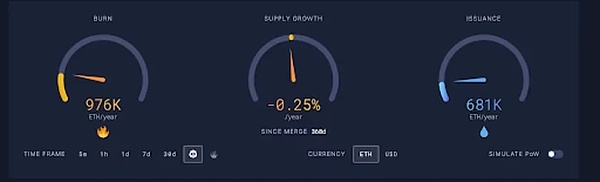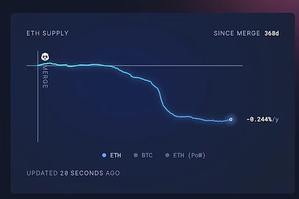 最值得注意的是,此次升级使ETH首次出现“通缩” ,这表示ETH的总供应量正在减少而不是增加。如今ETH的流通量比一年前减少了0.24%。供应量的减少部分源于一项名为EIP-1559的网络升级,该升级比合并早了大约一年。EIP-1559升级开始后,开始“燃烧”网络上的每笔交易中一些ETH。但ETH净通缩的出现,是以太坊合并进一步削减新 ETH 的发行速度后。