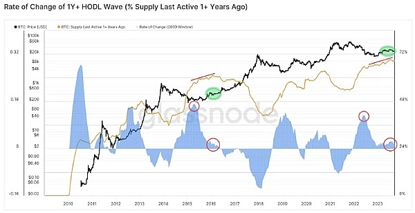 从图中可以看出,一年多没有变动的BTC数量的增长以及随后绘制的平台期与之前的周期一致。