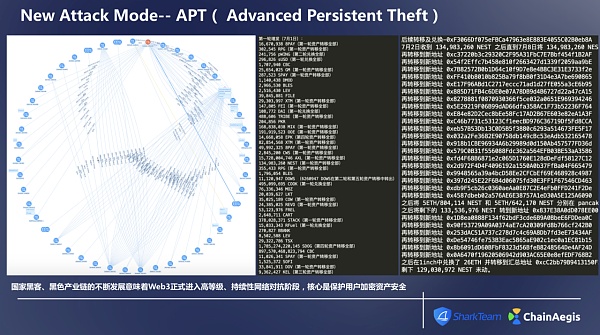 新型APT攻击(Advanced Persistent Theft):Web3黑暗森林中开始出现越来越多的高等级黑客,有些甚至是国家黑客。他们在Web3行业中获得的资金会经过一系列新型的洗钱模式变成现实资产,为后续不法行为提供资金。这一类黑客的资金转移方式非常复杂和隐蔽,通常会经过30至50个中间地址进行中转,并通过“混币”或“套壳”的方式进行洗钱,追踪难度很大。