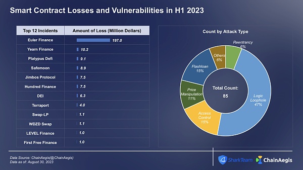 智能合约安全漏洞事件发生85起,其中47%是逻辑漏洞,主要原因是开发者安全意识薄弱,开发过程不够严谨,引入计算错误、业务逻辑错误等较低级的安全问题。此外,闪电贷攻击、权限管理等常见合约漏洞仍占比较高,均超过10%。总体表明,项目方在进行合约开发的过程中缺少必须的安全意识和技能,导致常见漏洞和初级问题不断发生。