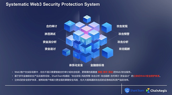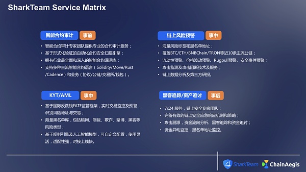 SharkTeam的愿景是保护Web3世界的安全。团队由来自世界各地的经验丰富的安全专业人士和高级研究人员组成,精通区块链和智能合约底层理论。提供包括链上大数据分析、链上风险预警、智能合约审计、加密资产追讨等服务,并打造了链上大数据分析和风险预警平台ChainAegis,平台支持无限层级的深度图分析,能有效对抗Web3世界的高级持续性盗窃(Advanced Persistent Theft,APT)风险。已与Web3生态各领域的关键参与者,如Polkadot、Moonbeam、polygon、OKX、Huobi Global、imToken、ChainIDE等建立长期合作关系。