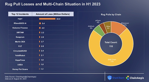 Rugpull欺诈事件数量呈快速增长趋势,发生了110次。其中73%发生在BNBChain上,这与BNBChain上的交易成本低、用户基数大以及新出现的Rugpull黑色产业链有直接关系。