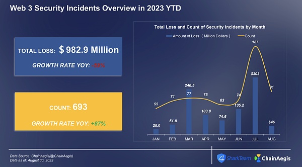 由于熊市影响,加密领域的资产总量降低,因安全问题产生的损失同比去年下降了59%。但这并不代表Web3领域的安全环境在变好,相反我们看到今年1月到8月,安全事件的数量达到693次,同比去年增加了87%,平均每个月有近90起安全事件,其中频率最高的是7月份,发生了187起安全事件。