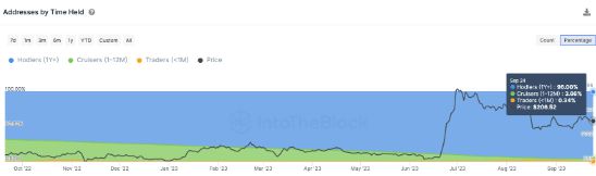 但是,尽管价格随后出现调整,长期持有钱包的数量目前已达到 2396 万。这使得长期持有者的主导地位达到 96%。