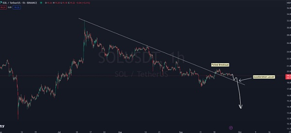 从他的K线走势图来看,Solana 在未能成功将阻力趋势线转变为支撑位后面临崩盘的危险。