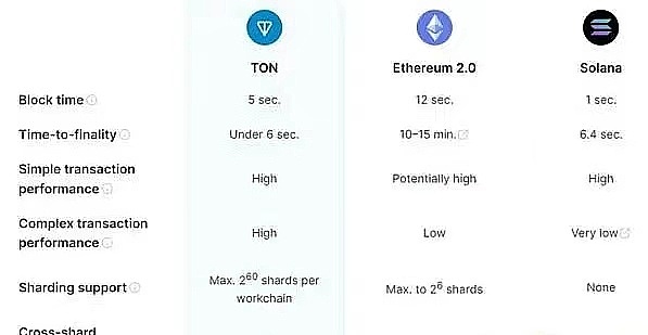 为了迅速了解TON的定位,可以直接将其与以太坊(ETH)和Solana(SOL)这两条L1公链进行比较。TON在区块处理时间和难度方面表现出色,超越了这两个竞争对手。