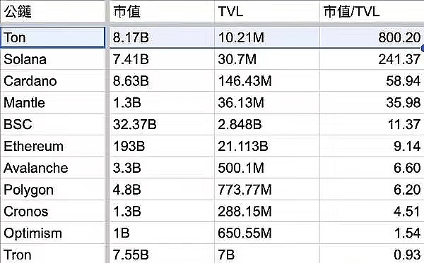 在熊市中逆势暴涨的TON代币,已经悄悄成为市值排名第十的代币。未来的涨幅是否值 得期待,或者是否泡沫即将来临,可以通过市值与TVL的比较来初步评估。