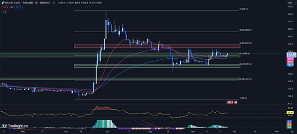 BCH 价格目前面临 230 美元至 238.1 美元的水平阻力区,与斐波那契 0.382 水平 237.8 美元重合。成功突破该阻力位可能预示着当前看涨趋势的延续。