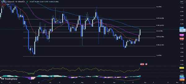 FXS 价格上周上涨 11.35%,并继续上涨,目前交易价格为 5.921 美元,截至今日上涨 5%。
