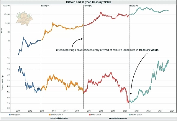 TXMC 从 X account 分享的一张值得注意的图表显示,10 年期国债收益率的“相对局部底部”与减半期一致。尽管使用与过去三个月最低水平不完全匹配的“相对”一词是可疑的,但可以在这个框架内检查过去的减半期。