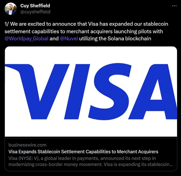 全球支付巨头 Visa 刚刚宣布将其稳定币结算能力扩展到 Solana,引起了轰动。