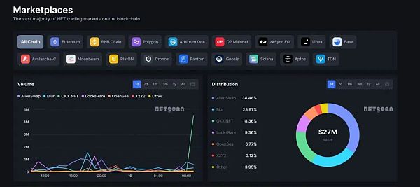 Nftscan 的数据显示,AlienSwap 1D的全链交易量已经跃居第一位,占比达到 34.48%。7D 全链交易量排名第二,占比22.74%