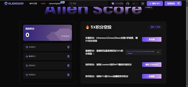 积分奖励主要以这三部分为主,关于积分获取的更多详情,可以参考之前的教程:明牌空杸 — 融资1200万美元的 AlienSwap 交互教程(增加多条L2公链tx)