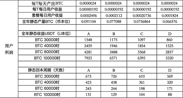 由于神马M50S矿机的售价主要对标产品是蚂蚁S19Pro,我们主要对比神马M50S和蚂蚁S19Pro这两款矿机。以BTC价格在30,000U和40,000U时为例,回本周期=BTC价格/日产出收益