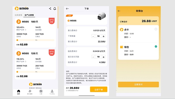 首先打开Bitroo,点击全产出套餐,选择想要购买的套餐,选择想要购买的算力 点击立即下单,选择钱包-立即支付。