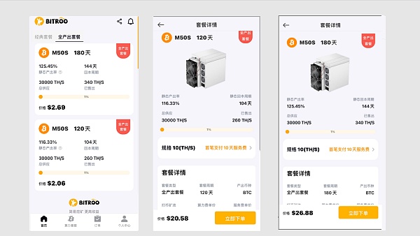 Bitroo平台重磅推出全产套餐,套餐包括M50S 120天和M50S 180天,静态产出率分别高达125%和135%。