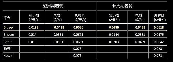 其次看租赁成本是否低廉。目前国内在做算力租赁主要有5个平台,分别是Bitro, Bitdeer, Bitfufu, 币安, Kucoin, 算力套餐分为短周期和长周期。