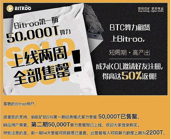 8月22日,Bitroo官方宣布当月上线第二批50,000T算力套餐已售罄。截至目前已有累计100,000T算力全部售罄。