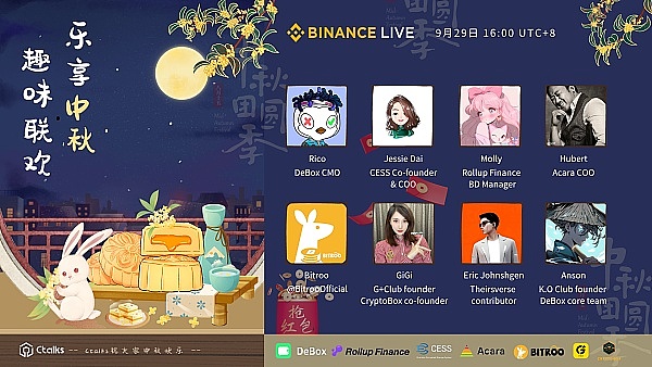 为了庆祝中秋佳节的到来,Ctalks在Binancelive上组织了一场中秋娱乐活动,特别邀请多位项目嘉宾和KOL大咖一起和大家做游戏,一起欢度中秋。