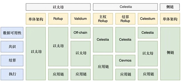 3、Celestium: 数据可用性层为 Celestia,共识层和结算层为以太坊,应用链为执行层。)