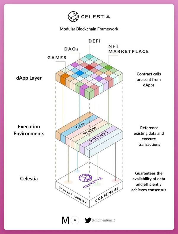 @CelestiaOrg 声称是「第一个模块化区块链网络」,它专注于共识和数据可用性,而将执行层放到了单独的链上。