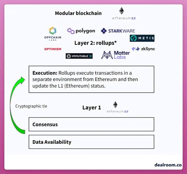 例如,一层用来处理执行,而另一层处理数据可用性,第三层处理共识。
