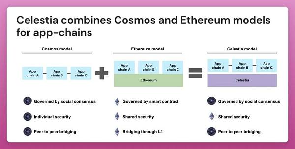 Celestia 的愿景是「将 Cosmos 的主权互操作区与具有共享安全性的以 Rollup 为中心的以太坊结合起来」。