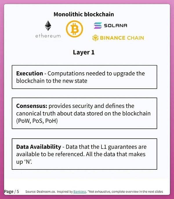 相较于上面提到的模块化区块链,比特币和以太坊属于单片区块链,它们只能处理三个核心功能: