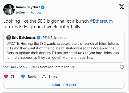 9 月 28 日,彭博资讯分析师 James Seyffart 表示,“看起来 SEC 可能会在下周放行一批以太坊期货 ETF。”
