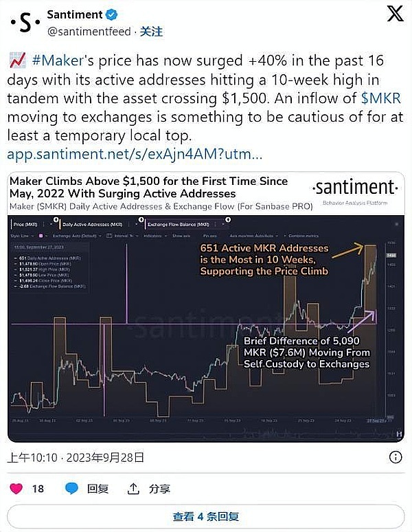 市场情报平台 Santiment 建议交易者在 Maker (MKR) 持续上涨的情况下保持谨慎。此外,Santiment 发现活动显着增加,约有 5,090 个 MKR 代币(相当于约 760 万美元)从自我托管钱包存入中心化交易所。外汇存款的增加可能预示着即将到来的市场逆转。