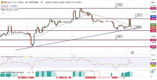 从四个小时的时间范围来看,比特币从 26,000 美元附近的支撑位反弹,这是一个关键水平,也是 BTC 的心理锚点。