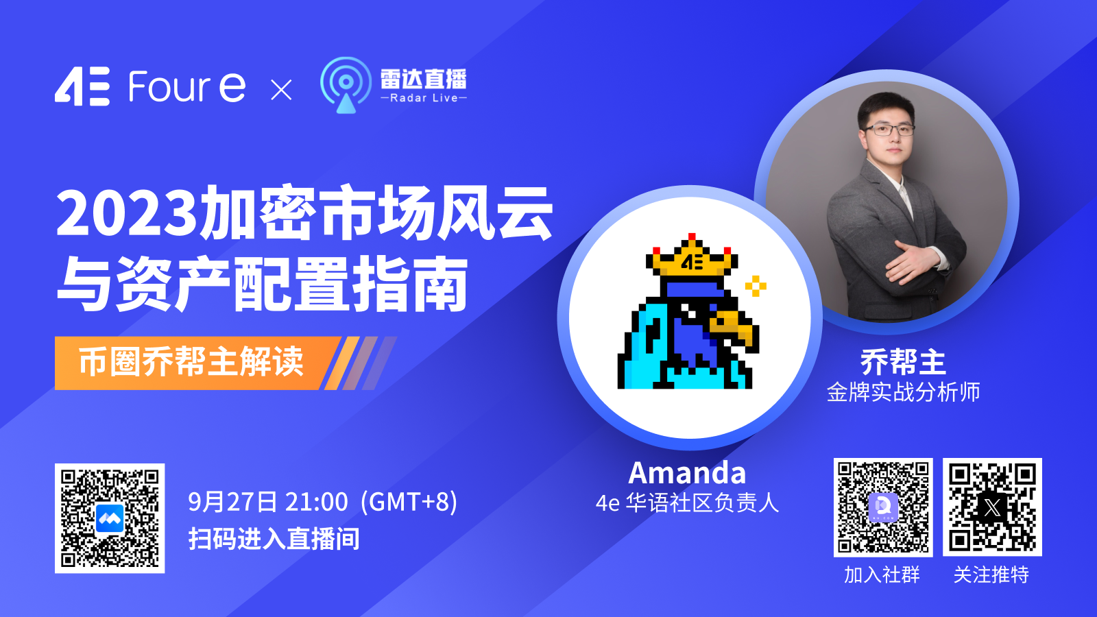 在2023年9月27日,4e交易所与雷达直播成功合作,举办了一场名为“解读2023:加密市场风云与资产配置指南”的AMA直播活动。本次活动分享了有关全球金融市场的重要见解,引导用户制定更明智的资产配置策略。嘉宾包括4e交易所的华语社区负责人Amanda以及金牌实战分析师乔帮主,活动由4e官方主持。
